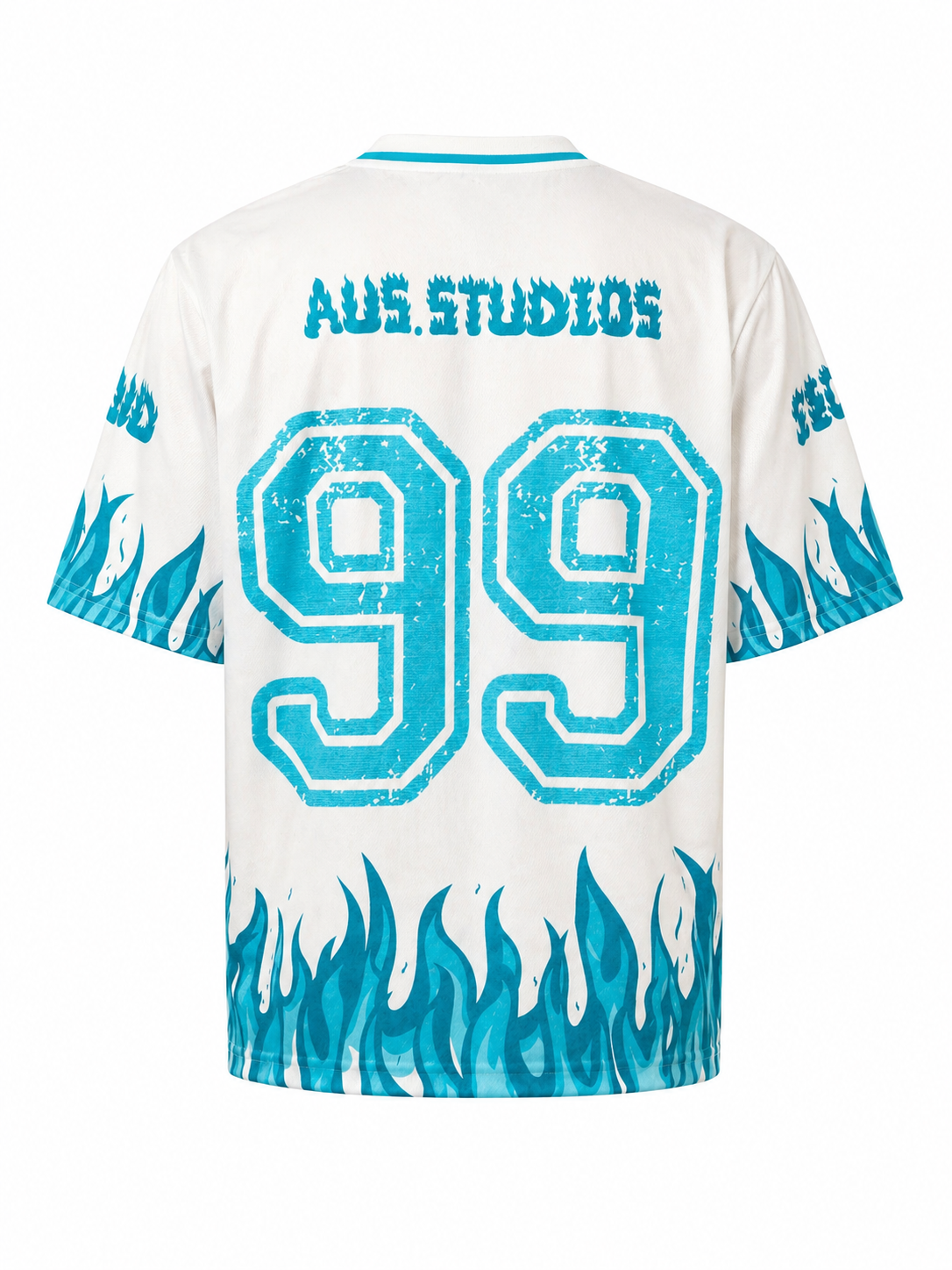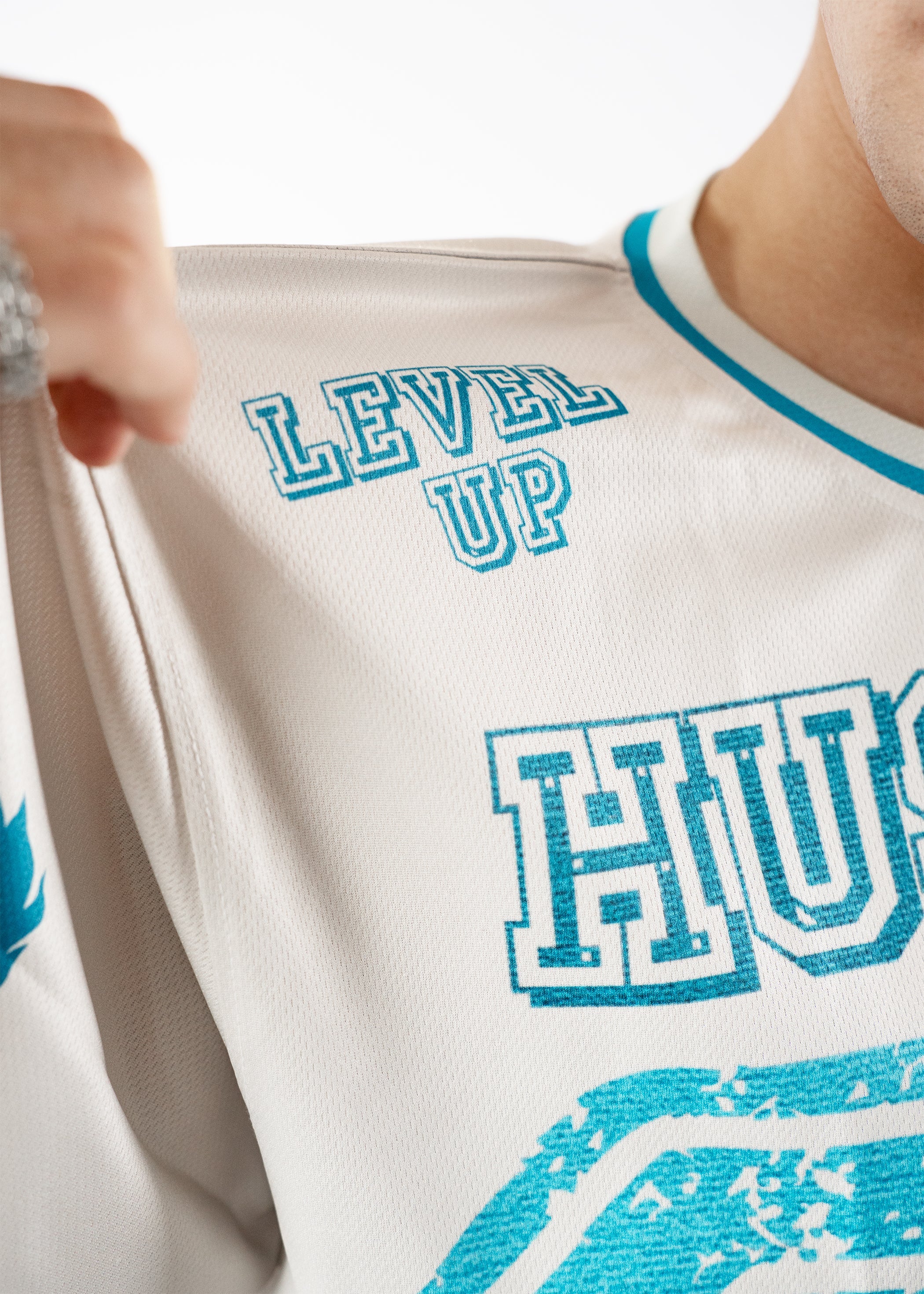 A throwback built for today’s hustlers. Off-white base lit with electric blue flames, bold front-and-back prints, and shoulder hits that say LEVEL UP and 24/7. Not just style—it's a statement. Wear it loud, wear it relentless.