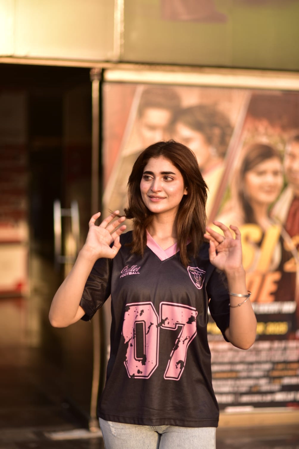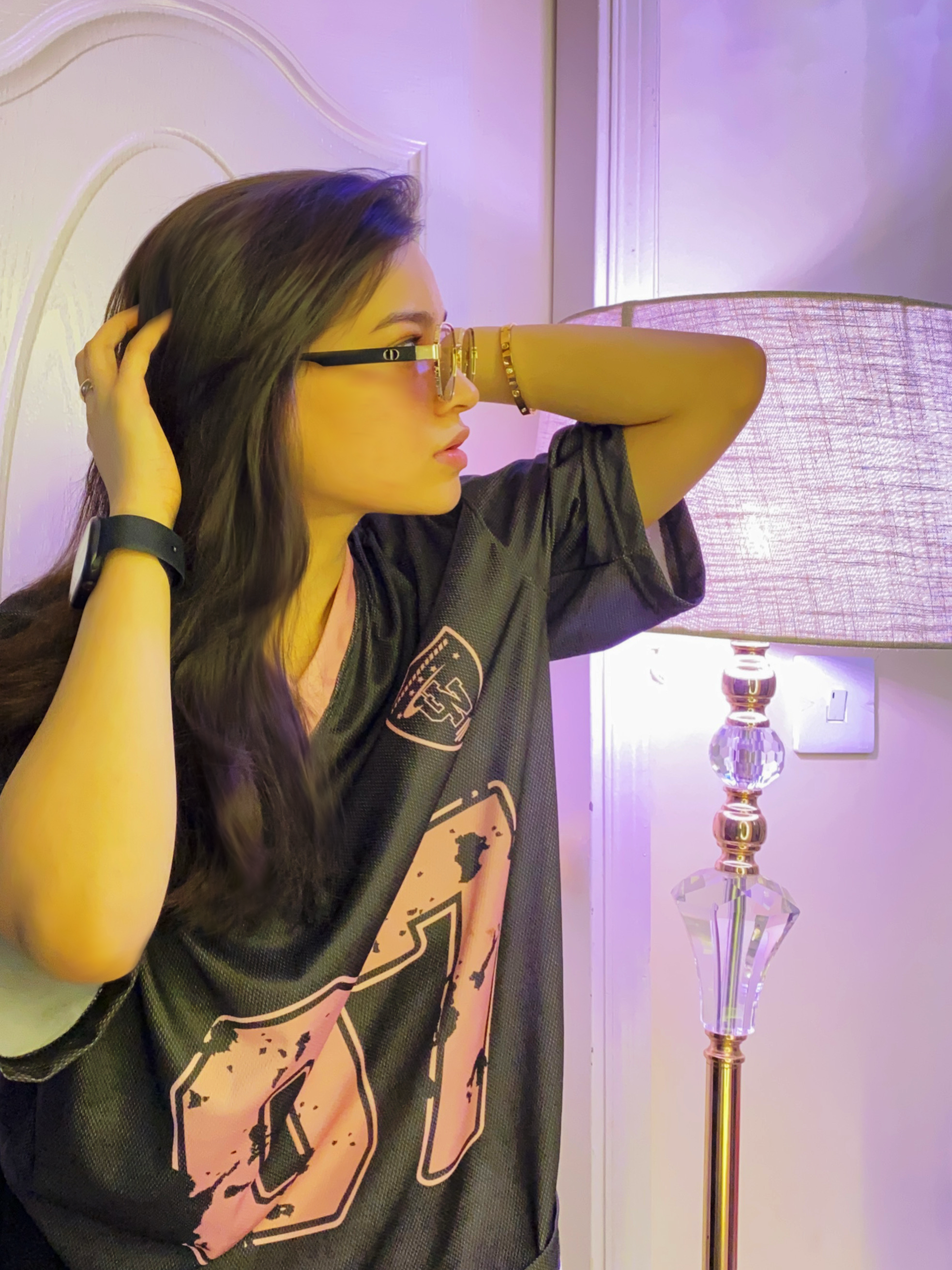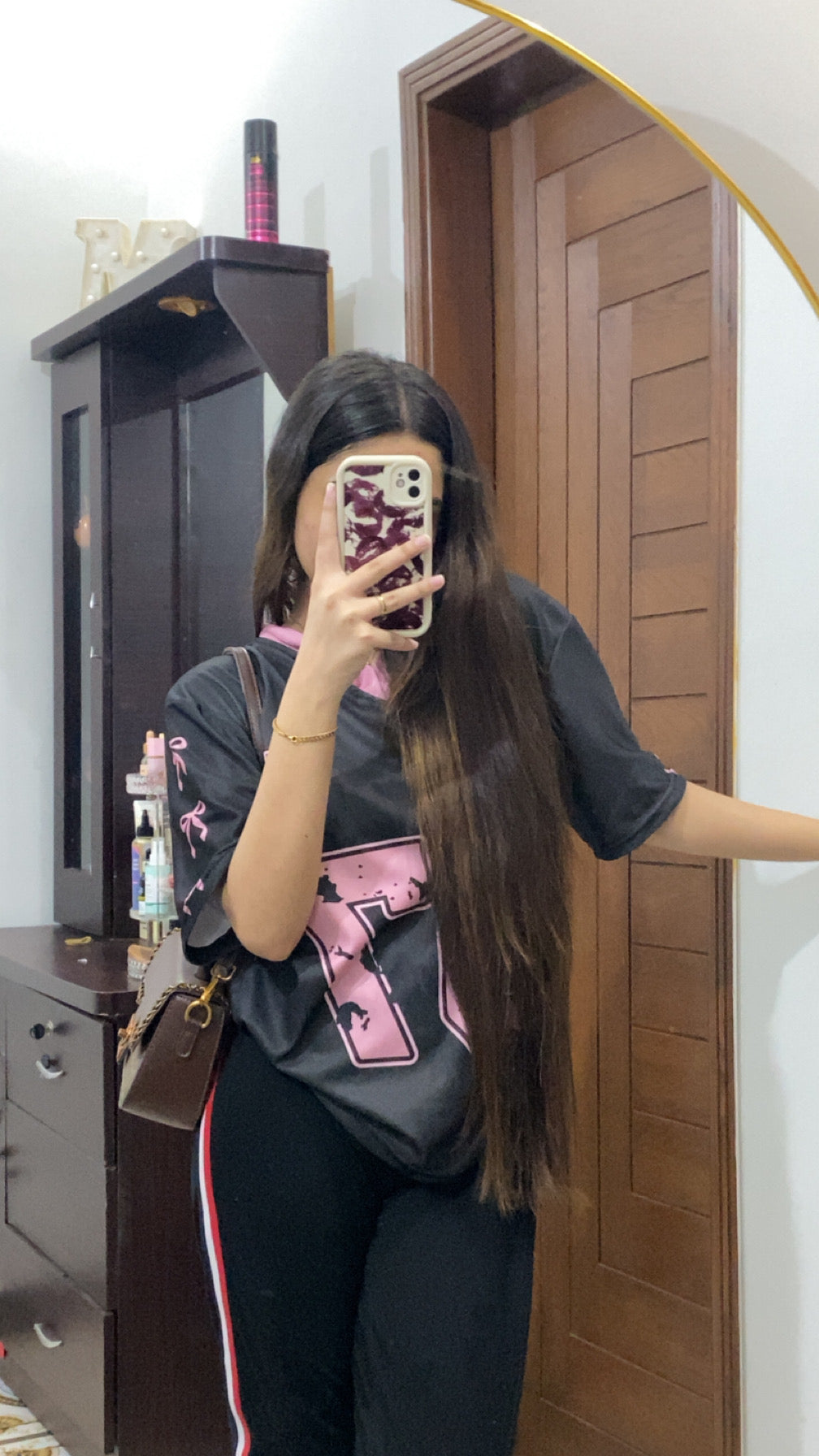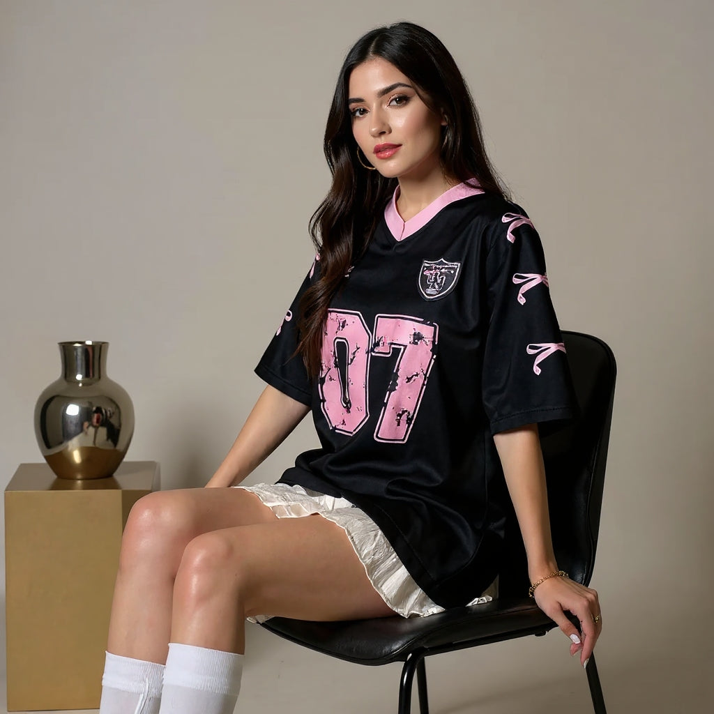 Oversized black jersey top featuring a bold, distressed “07” in pastel pink—bringing sporty attitude with a fashion-forward twist.